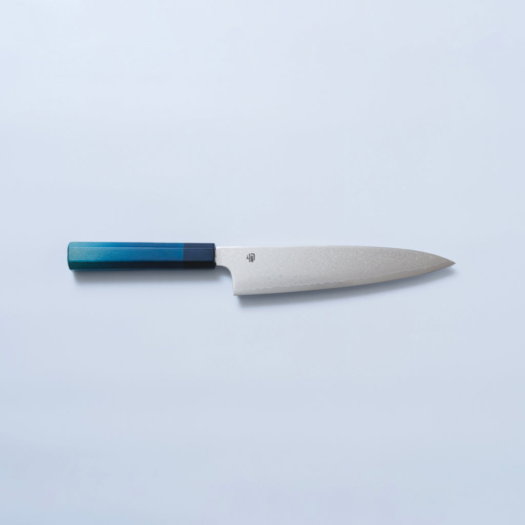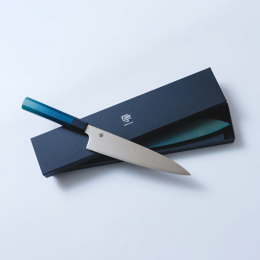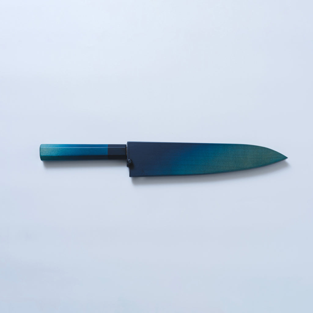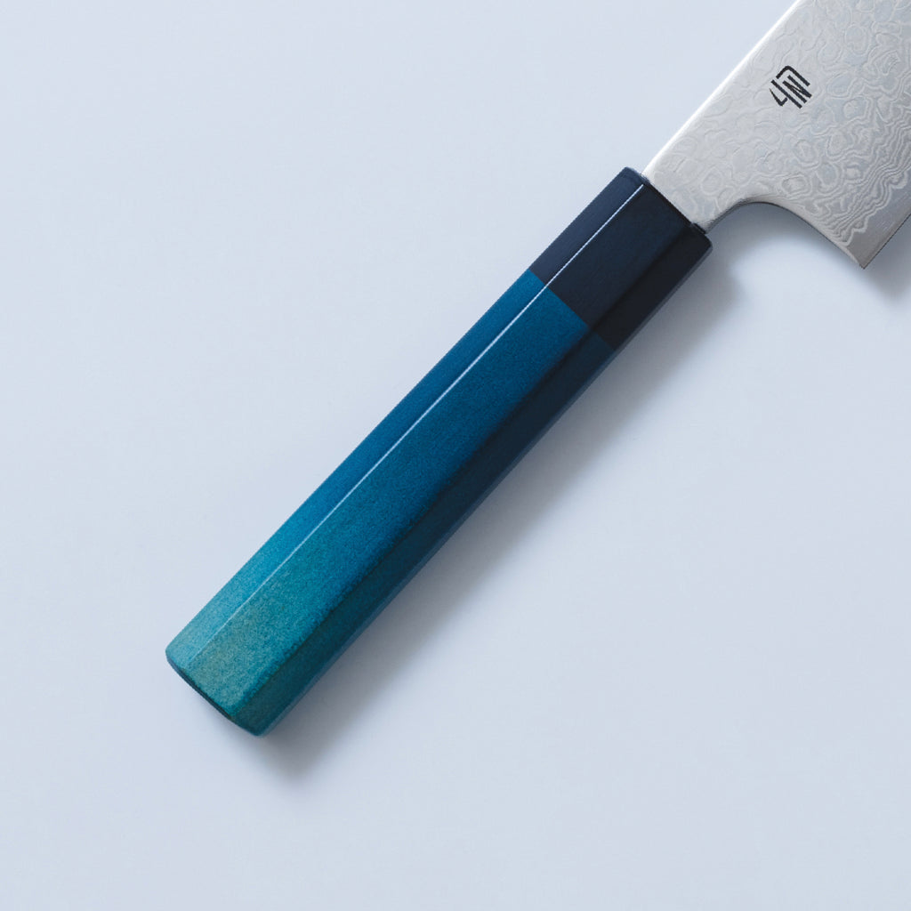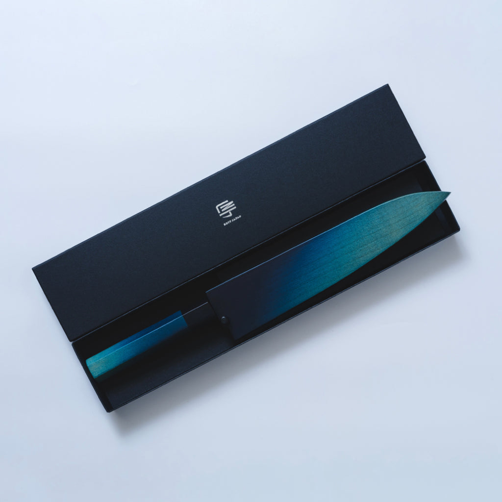 抗菌性や消臭効果があるとされ私たちの生活を支えてきた藍染め。この技術を搭載することで機能性とビジュアルを両立し誕生した「藍包丁」。大阪の伝統である堺刃物、そして徳島の歴史に根付く藍染めを掛け合わせた製品です。異なる地域・異なる技術の職人たちによる「職人コラボレーション」は、それぞれの技術がもつ価値をかけあわせることにより付加価値の向上を目指しています。ひとつの製品で複数の産地に利益をもたらし、日本の伝統技術の活性化を目指すプロジェクトでもある藍包丁。ぜひ職人技の共演をお楽しみください。