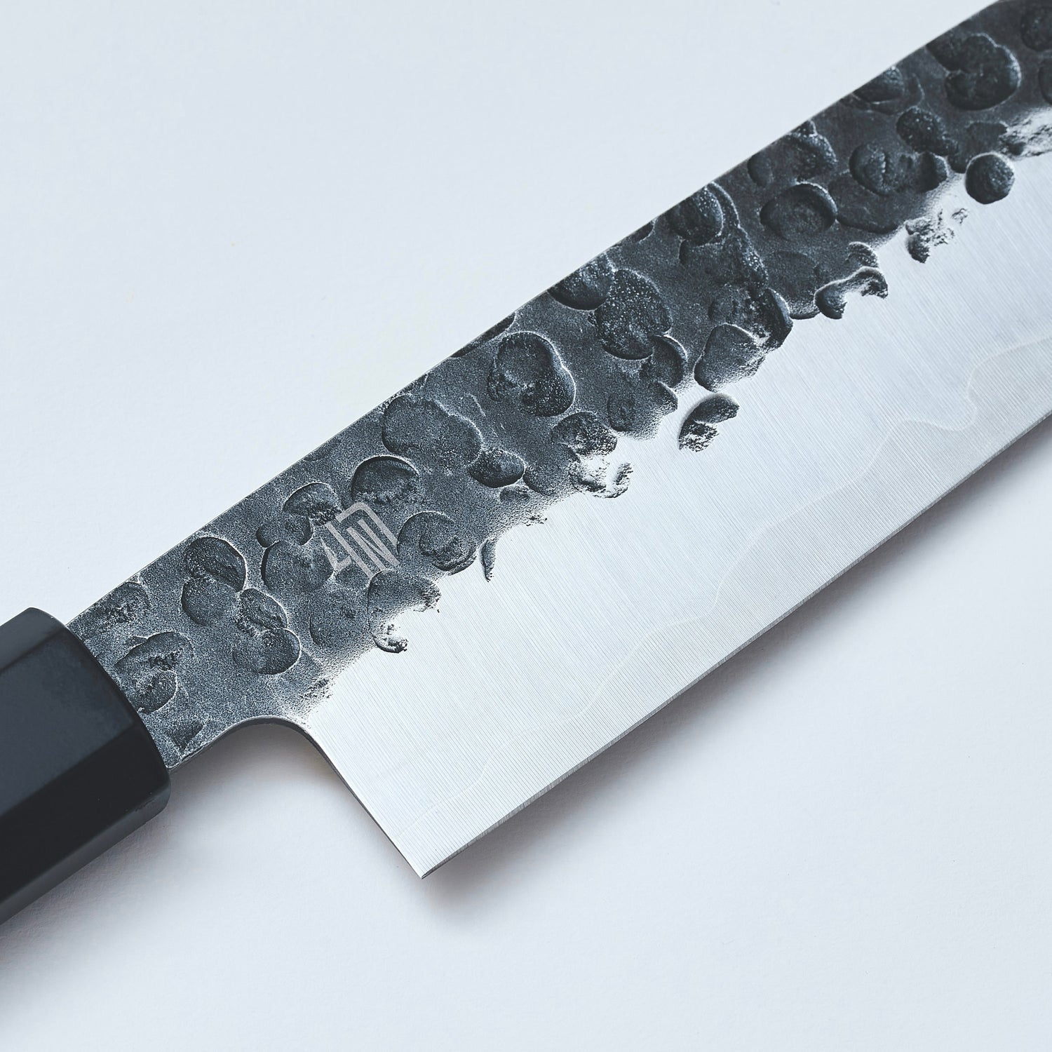 伝統的な黒打(くろうち)に、職人による槌目(つちめ=ハンマーで叩いた跡)が唯一無二の存在感を誇る1本です。黒打とは江戸時代発祥の伝統的な製法のことで、刃の表面にをあえて磨かず、黒い酸化被膜を残した仕様のことをいいます。これまでの黒打は酸化被膜ができやすい鋼(はがね)の素材で作られていましたが、切れ味が鋭いかわりに錆びやすい特性もありました。それを今回は錆びにくいステンレスで黒打を作ることに成功。和包丁の本格的な雰囲気をまといながらも、ご家庭でのメンテナンス性を両立させた1本です(このシリーズは鞘が入らないタイプですのでご了承ください)。