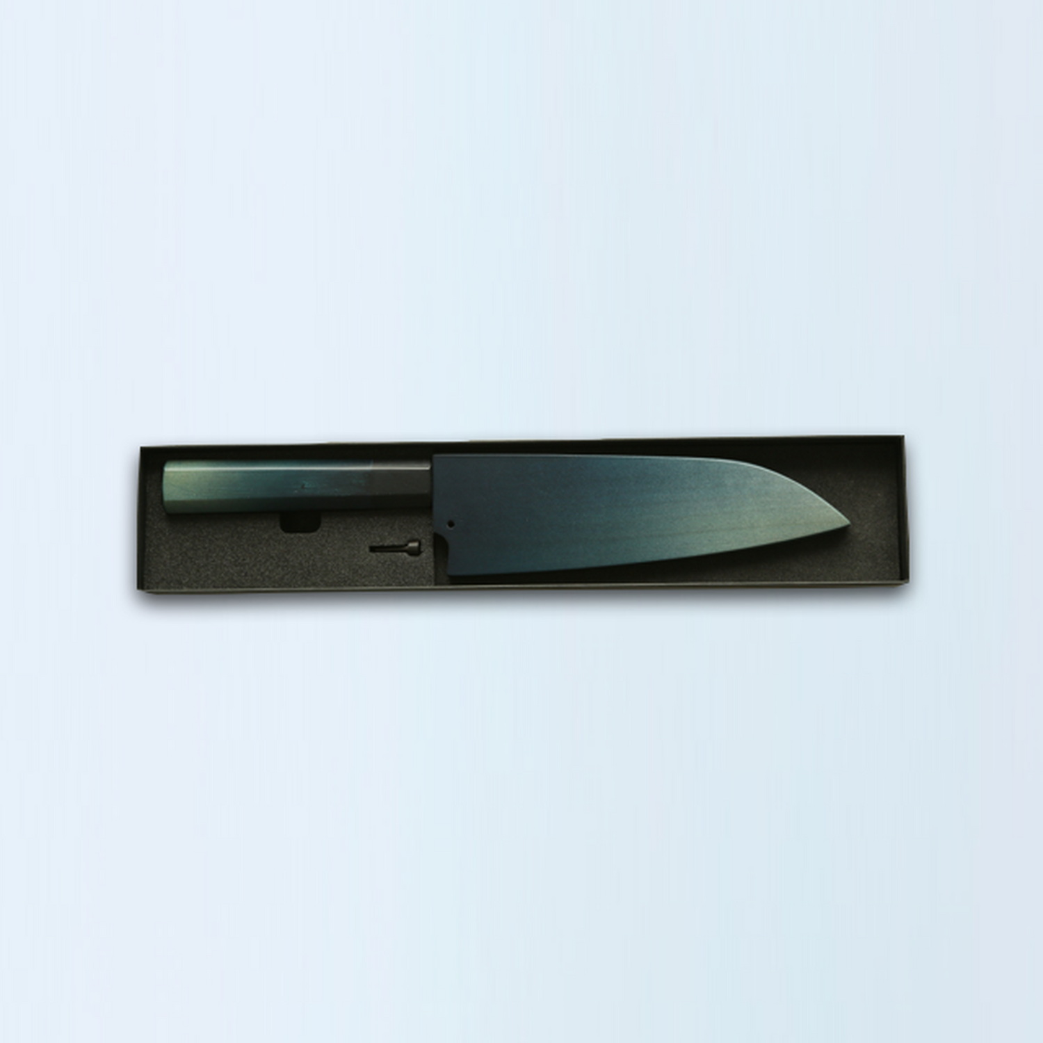 抗菌性や消臭効果があるとされ私たちの生活を支えてきた藍染め。この技術を搭載することで機能性とビジュアルを両立し誕生した「藍包丁」。大阪の伝統である堺刃物、そして徳島の歴史に根付く藍染めを掛け合わせた製品です。異なる地域・異なる技術の職人たちによる「職人コラボレーション」は、それぞれの技術がもつ価値をかけあわせることにより付加価値の向上を目指しています。ひとつの製品で複数の産地に利益をもたらし、日本の伝統技術の活性化を目指すプロジェクトでもある藍包丁。ぜひ職人技の共演をお楽しみください。