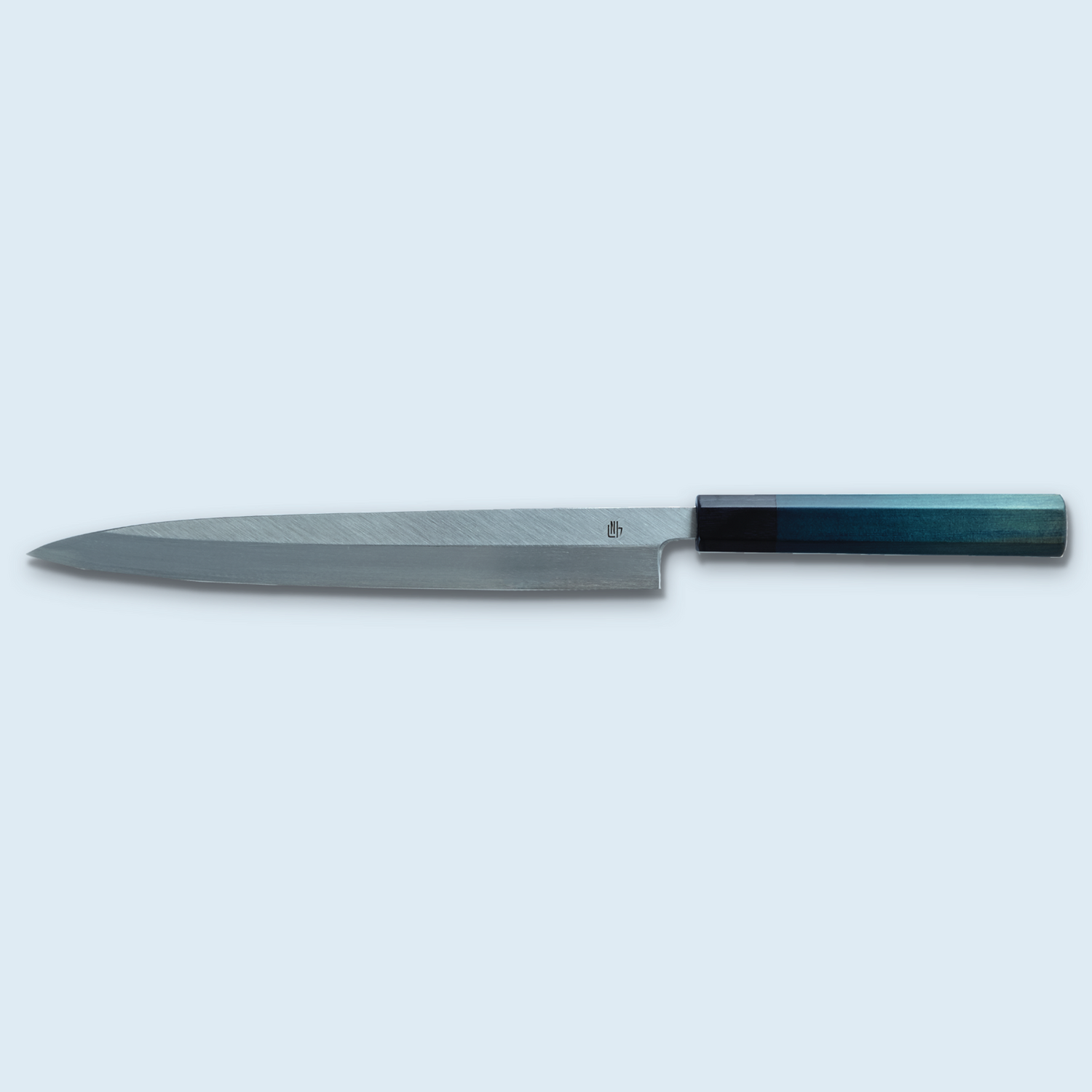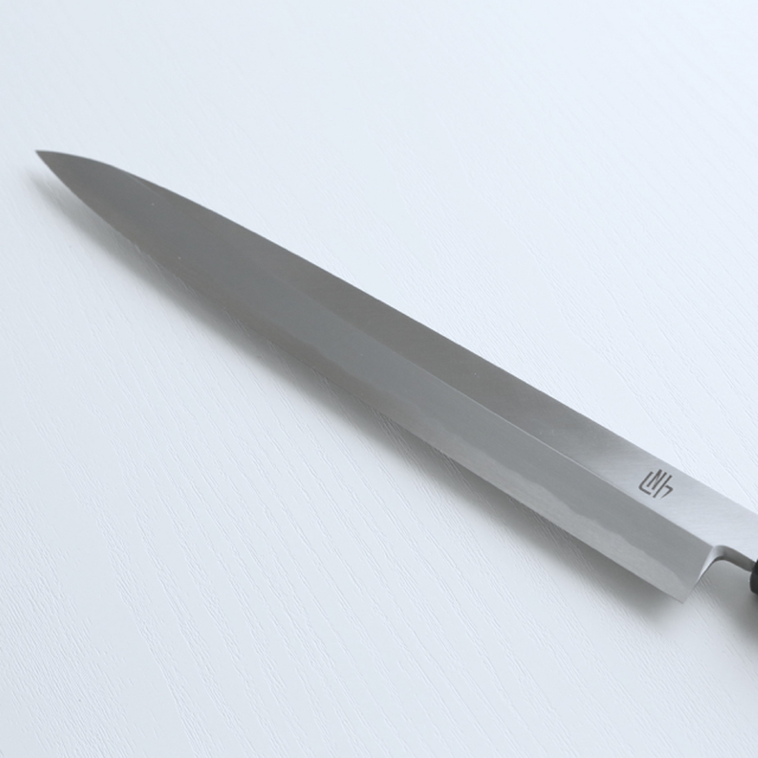左利き用の柳刃が登場。魚をさばいた後、綺麗な刺身を作るときに使用します。刃は片方にしか付いていない片刃となっており、この形状が、魚の断面をスパッと切り、角をキリッと立てることができます。三徳や牛刀が押すように切るのに対して、柳葉は引いて切るため、刃渡りが20cm以上あります。日本伝統の鋼を使用しているため、両刃の包丁よりも硬さと切れ味に優れています。その代わり、刃は錆びやすいのでまめにお手入れください。