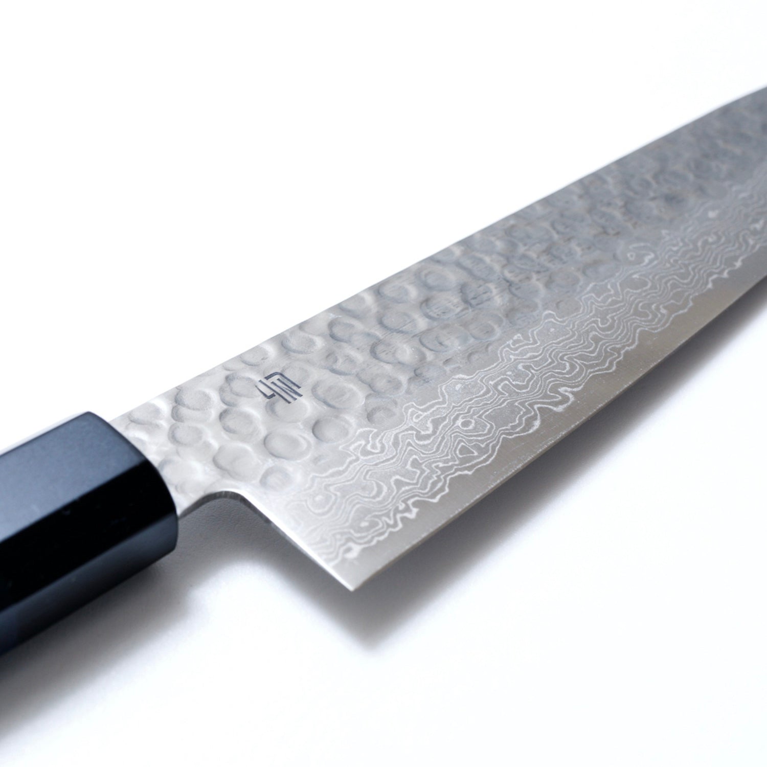 ダマスカスといわれる波紋様が特徴で、職人がハンマーで叩いた槌目(つちめ)は刃から食材が離れやすくなる効果もあります。